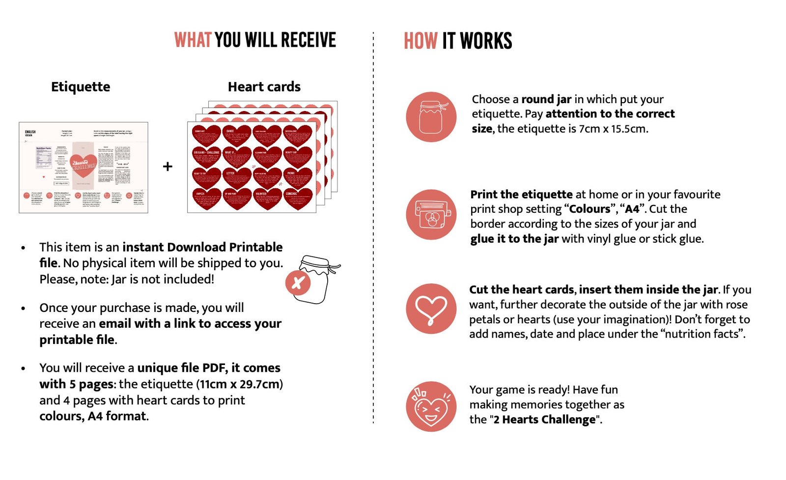 This isn’t just a game – it’s a journey for two hearts. Inside the jar, you’ll find over 60 beautifully designed challenge cards that encourage love, creativity, and togetherness.